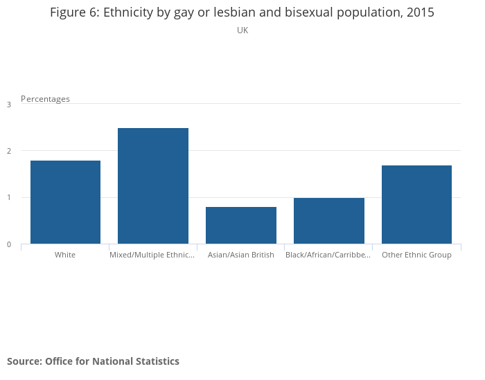 Image .csv .xlsIn 2015, the Annual Population Survey found that 1.8% of the population who describe their ethnicity as “White” also identified themselves as LGB. The highest percentage was seen amongst those who describe their ethnicity as “Mixed or Multiple ethnic groups” where 2.5% identified themselves as LGB.