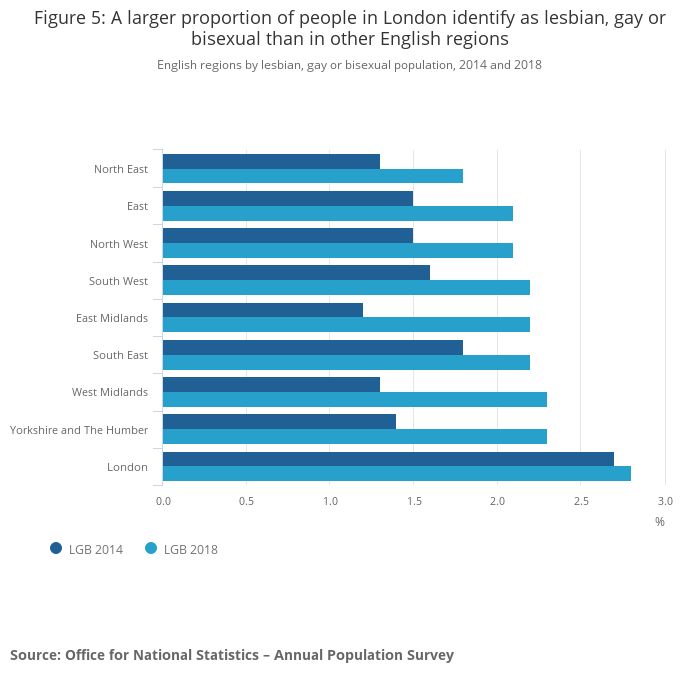 - Among English regions, people in London were most likely to identify as LGB (2.8%), with people in the North East the least likely (1.8%).