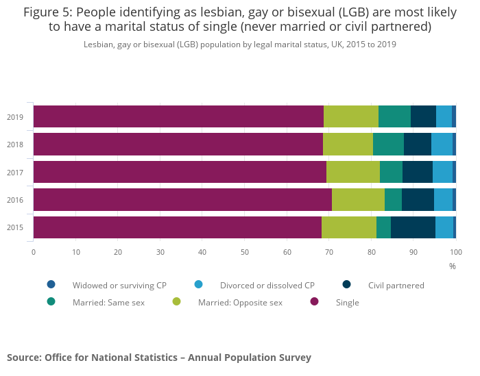 Among those identifying as lesbian, gay or bisexual (LGB) in 2019, more than two-thirds (68.8%) were single, meaning that they had never married or entered into a civil partnership. This is double the proportion of those who identified as heterosexual or straight and had never entered into a legal partnership (34.4%). A possible reason for this difference is the younger age structure of the LGB population combined with the increase in the average age of marriage.