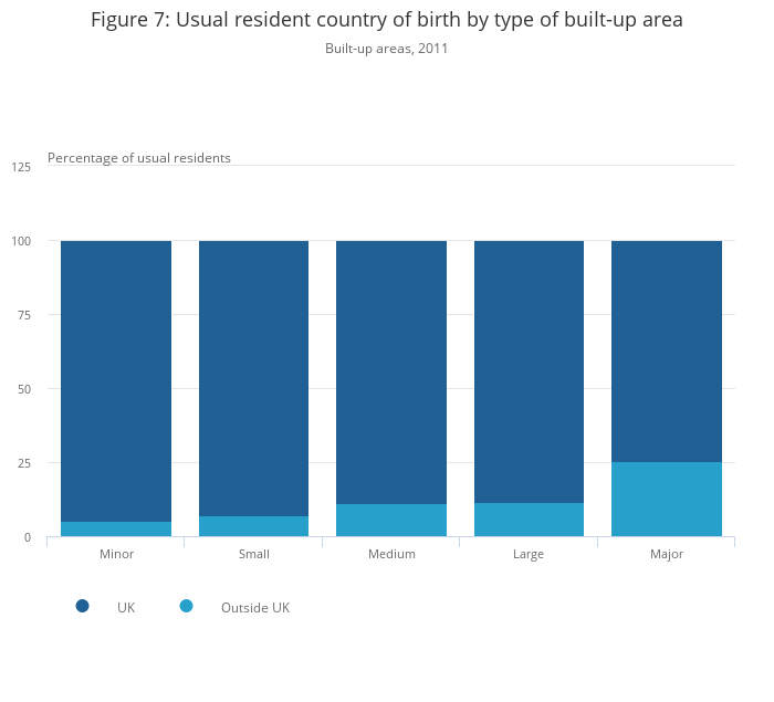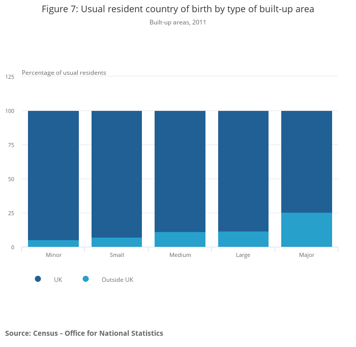 The biggest difference between minor and major built-up areas was in the percentage of households where no people in the household had English as their main language, increasing from 1 per cent in minor areas to 9 per cent in major areas. This is to be expected given that the larger built-up areas have a higher percentage of the population that were born outside of the UK.