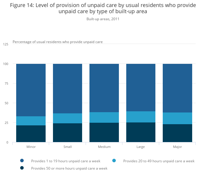 Within built-up areas the percentage of usual residents that provided some level of unpaid care each week decreased as the size of the area increased, from 12 per cent in minor areas to 9 per cent in major areas. The amount of care provided by those that did provide care also varied by the size of the area, with more hours of care provided in the larger built-up areas (Figure 14).