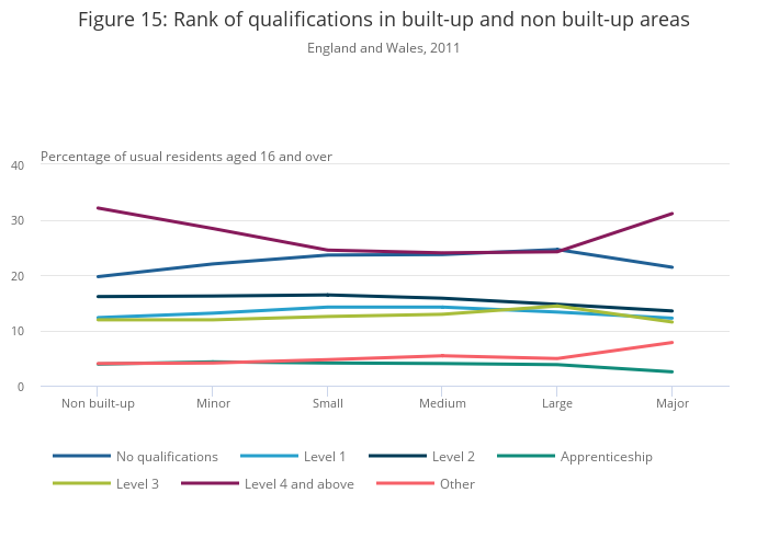 Within built-up areas the highest level of qualification varied by the size of the area. The group with the biggest variation between the different sized areas was the Level 4 and above qualifications. The percentage of usual residents aged 16 and over with this as their highest level of qualification decreased from 28 per cent in minor built-up areas to a low of 24 per cent in medium areas, and then increased again to a high of 31 per cent in major built-up areas.
