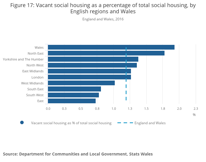 Vacant social housing as a percentage of total social housing. Vacant social housing in England uses private-registered provider and local authority vacancies for general needs and self-contained rent housing. Vacant social housing in Wales includes vacancies from registered social landlords and local authorities and comprises general needs, sheltered, extra-care and other supported-rent housing.