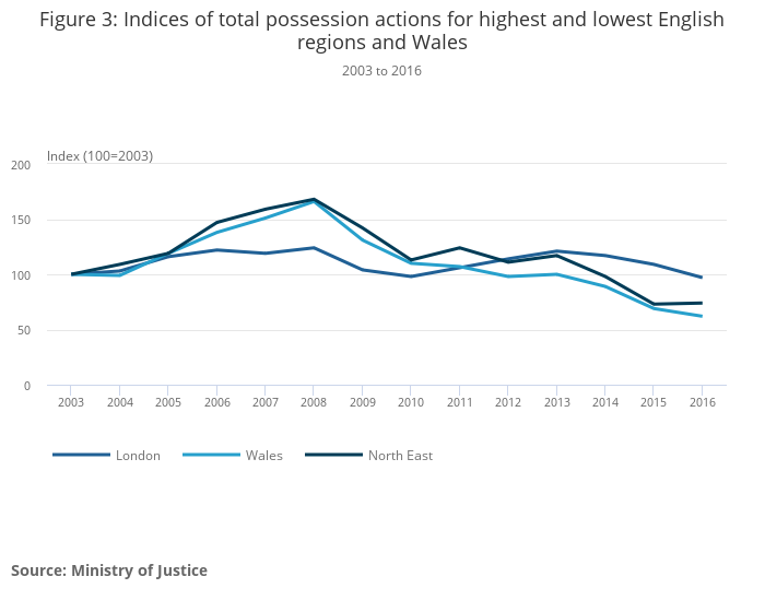 Figure 3 shows the indexed number of possession actions for the highest and lowest English regions and Wales between 2003 and 2016. Possession actions were highest for all three regions in 2008, but while there has been an overall decrease in number of possession actions for both Wales and the North East since then, the number of possession actions in London increased between 2010 and 2013 before decreasing in 2016 to slightly below the level of 2010. London is the region with the most possession actions in 2016, reflecting lower housing affordability in this region.