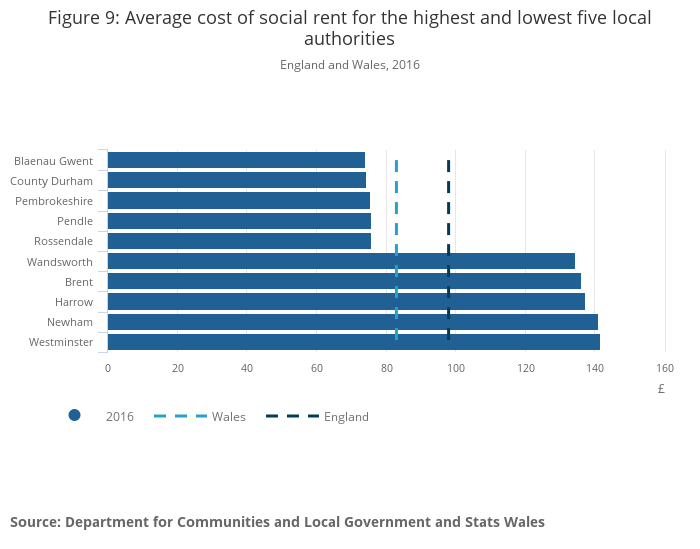 Social rent costs for England refers to general needs social housing from privately registered providers only, and excludes local authority provided social housing. For Wales, average social rent cost is based on all social housing stock so includes social rent from registered social landlords and local authorities (and includes self-contained general needs, sheltered, other supported and extra care units).