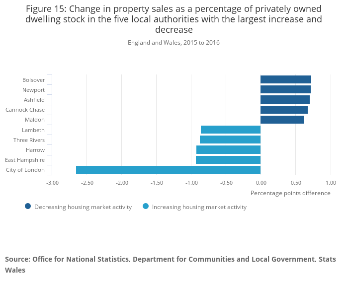 .png (16.8 kB) .xls (28.2 kB)About half of local authorities in England and Wales had a decrease in housing market activity in 2016. Figure 15 shows that three out of the five local authorities with the largest decrease between 2015 and 2016 were in London, with the biggest decrease in City of London of 2.65 percentage points. All London boroughs had lower housing market activity in 2016 than in 2015, with the exception of Tower Hamlets, which had an increase of 0.44 percentage points. The biggest increase overall was in Bolsover in the East Midlands, with an increase of 0.73 percentage points.
