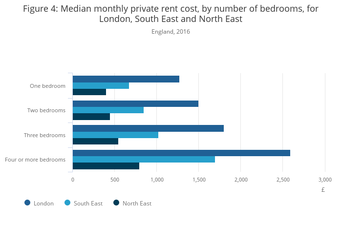 Download this chart Figure 4: Median monthly private rent cost, by number of bedrooms, for London, South East and North East