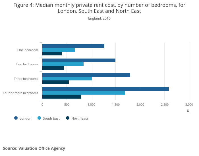 Figure 4: Median monthly private rent cost, by number of bedrooms, for London, South East and North East
