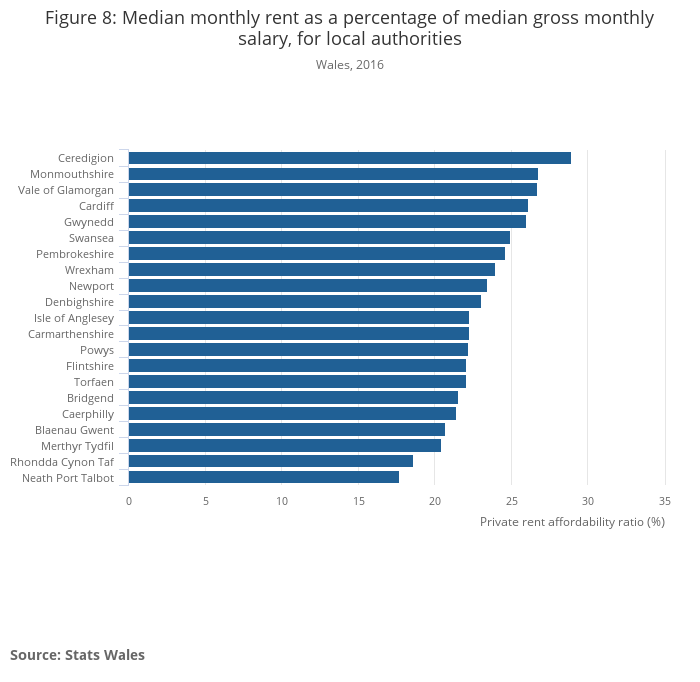 Image .csv .xlsMonthly private rental affordability has been calculated for Welsh local authorities but on the basis of two-bedroom properties, which were the most common unit of privately rented accommodation in Wales in 2016 (35%). Based on two-bedroom properties, the median monthly private rent for Wales was 23% of median monthly gross salary. This means that someone living in a two-bedroom property in Wales could expect to spend 23% of their monthly salary on private rent. Statistics on the overall median monthly private rent price are not available for Wales and so the private rental affordability ratios are not directly comparable between England and Wales.
