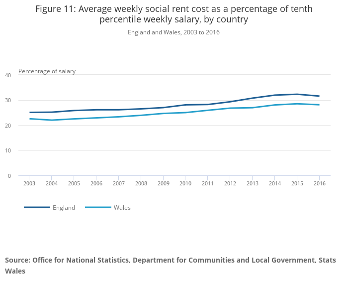 Average weekly social housing rent cost as a percentage of 10th percentile gross weekly salary, for full-time workplace-based earnings. Data are not directly comparable between England and Wales. The cost of social rent for England only includes private registered providers whereas for Wales, average social rent cost is based on all social housing stock so includes social rent from registered social landlords and local authorities (and includes self-contained general needs, sheltered, other supported and extra care units).