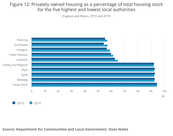 Figure 12 shows privately-owned housing as a percentage of total housing stock for the highest and lowest five local authorities in England and Wales in 2016, comparing 2016 with 2010. The local authority with the lowest percentage of privately-owned housing in 2016 was Hackney in London with 57.1%, an increase of 1.67 percentage points since 2010. The lowest five local authorities for privately-owned housing in 2016 have had an increase of between 1.67 and 2.75 percentage points since 2010.