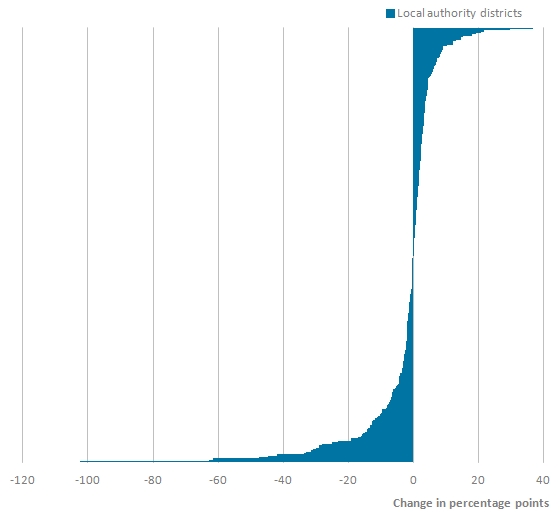The share of privately-owned housing out of all housing stock decreased between 2015 and 2016 for nearly a third of local authorities. However, only two of these had a decrease of more than 1 percentage point. These were St. Edmundsbury in the East of England (1.1 percentage points decrease) and Hounslow in London (5.7 percentage points decrease).