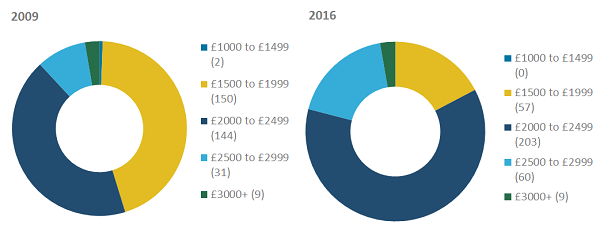 Figure 6 shows the median monthly salary for all local authorities in England and Wales for 2009 and 2016, grouped by salary bands of £500. Out of all the local authorities with available earnings data, 61.7% had a median monthly salary between £2,000 and £2,499 in 2016, compared with 42.9% in this category in 2009. This highlights the increase in nominal earnings since the economic downturn, although there were nine local authorities that fell in the £3,000 or more category for both years.