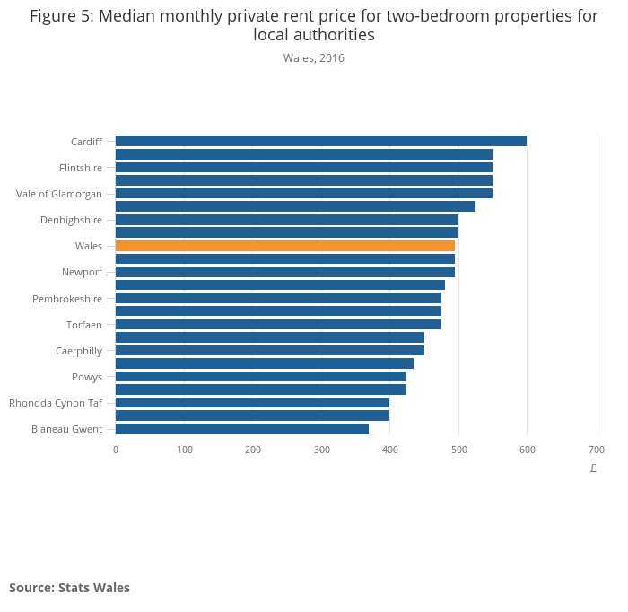 Median monthly private rent data for Welsh local authorities is collected separately through Rent Officers Wales and accessed through Stats Wales. For Wales, the highest number of private rented accommodation was for two-bedroom properties, for which the median private rent price was £495 per month. Figure 5 shows the median rent price for two-bedroom properties for local authorities in Wales in 2016.