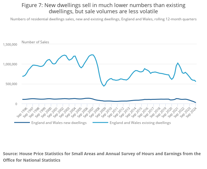 There is interest in the effect of new house building on housing affordability. Across England and Wales, newly built dwellings were, on average, more expensive than existing properties. In the year to September 2024, the average new dwelling sold for £350,000, compared with £280,000 for an existing dwelling. However, existing dwellings make up most sales, with new builds being just 4.7% of sales in England and 2.8% of sales in Wales in the year to September 2024.