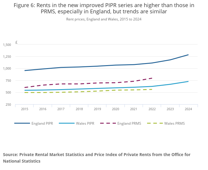 PIPR excludes room-only lettings, which tend to be cheaper, while PRMS includes them