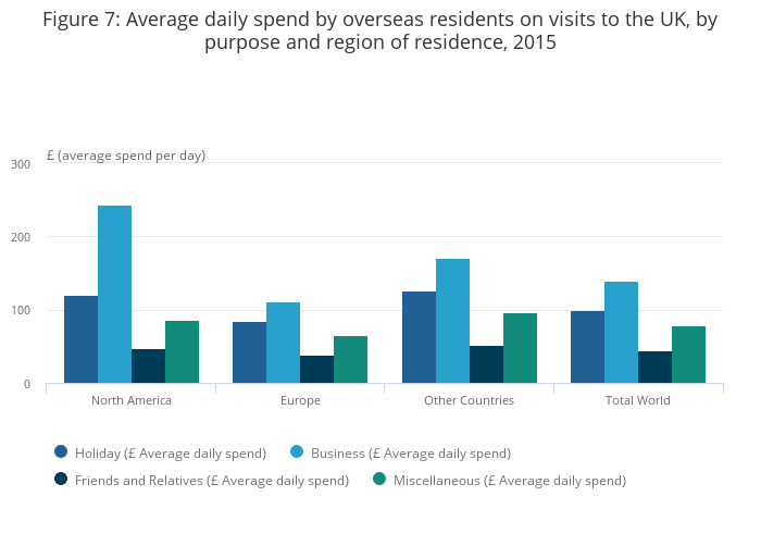Visitors from “Other Countries” spent the most per visit; an average of £1,310. However, their spend per day was less than residents from North America or Europe. Residents of North America spent the highest amount per day, increasing from £94 in 2011 to £103 in 2015. Europeans spent the least per day on their visits to the UK, £70 in 2015, with those from the EU Other sub-region (residents of countries which joined the EU from 1 January 2004 onwards) spending an average of £38 per day.