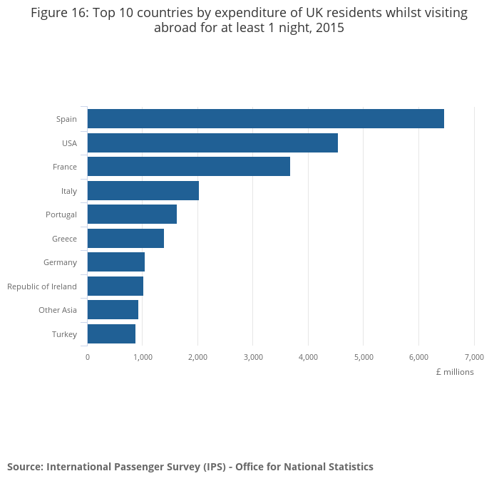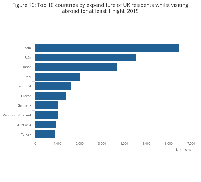 Figure 16: Top 10 countries by expenditure of UK residents whilst visiting abroad for at least 1 night, 2015