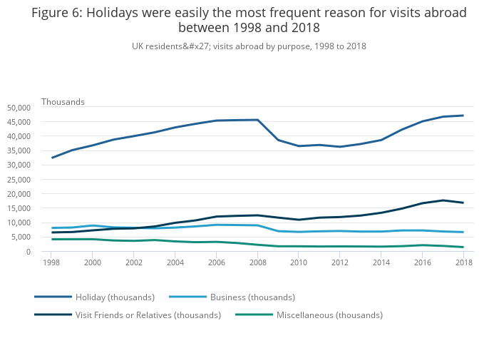 The most common reason for travelling abroad was for holidays. There were 47.0 million holiday visits abroad by UK residents, 1% more than in 2017 and accounting for almost two-thirds (66%) of visits. By comparison, there were 32.3 million holiday visits abroad 20 years earlier, in 1998 (Figure 6).
