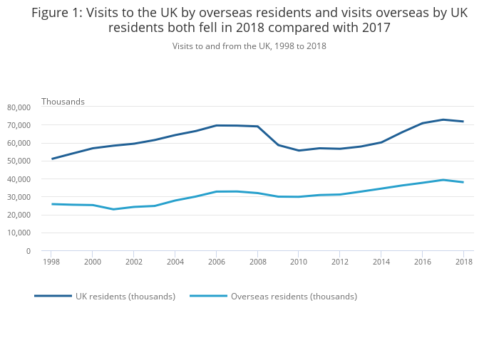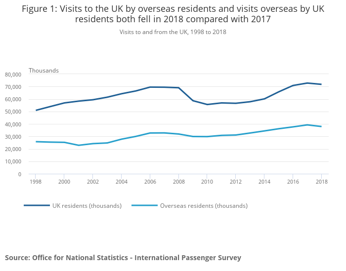 There were fewer overseas residents’ visits to the UK in 2018 than in 2017 and also a fall in the number of visits abroad by UK residents.
