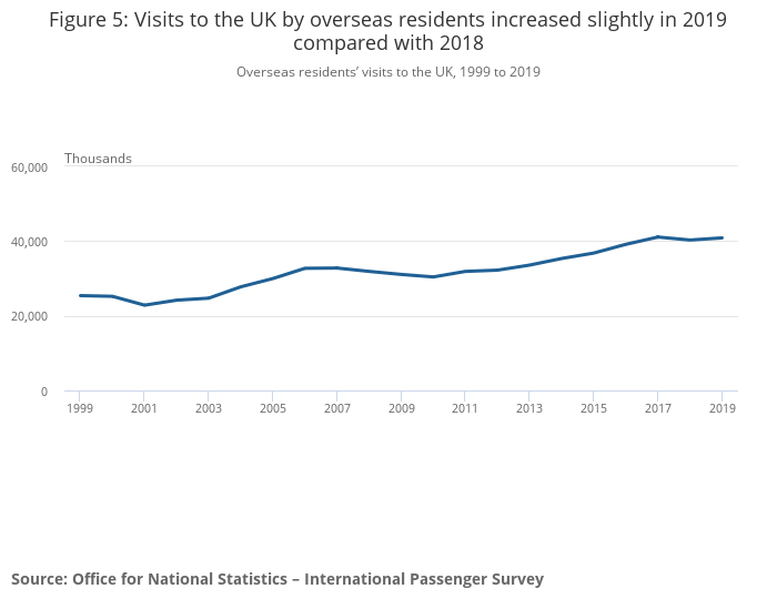 Overseas residents made 40.9 million visits to the UK in 2019, an increase of 0.6 million compared with 2018.