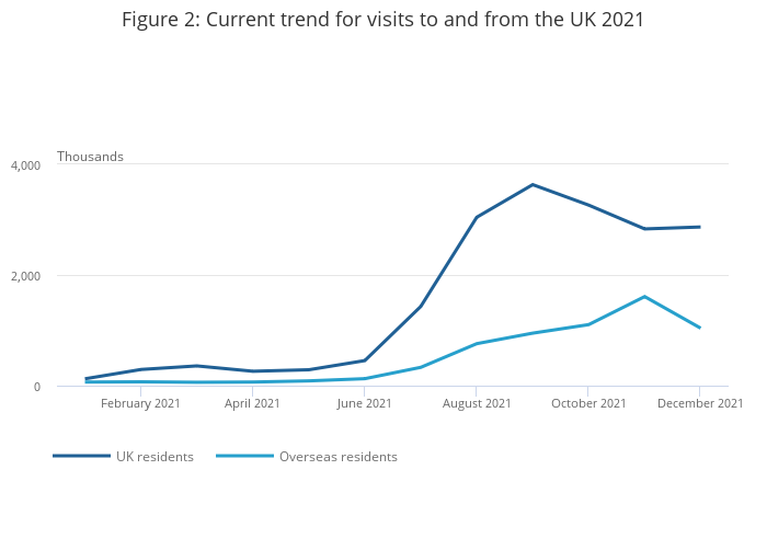 Normal seasonal trends in visits were not seen in data for 2021 as both visits to and from the UK continued to increase all year after the easing of travel restrictions because of the coronavirus (COVID-19) pandemic. The difference in travel patterns for 2021 compared with pre-coronavirus pandemic trends can be seen in Figures 1 and 2.