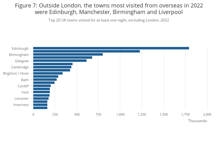 Download this chart Figure 7: Outside London, the towns most visited from overseas in 2022 were Edinburgh, Manchester, Birmingham and Liverpool
