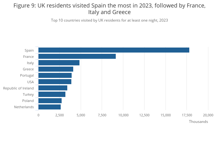 Image .csv .xlsThe top 10 countries remained unchanged from 2022, with Spain remaining the most popular country visited by UK residents (Figure 9). There were 17.8 million visits to Spain by UK residents in 2023, making up 21% of total visits abroad. France was the second most popular country, with 9.2 million visits in 2023, making up 11% of total visits.