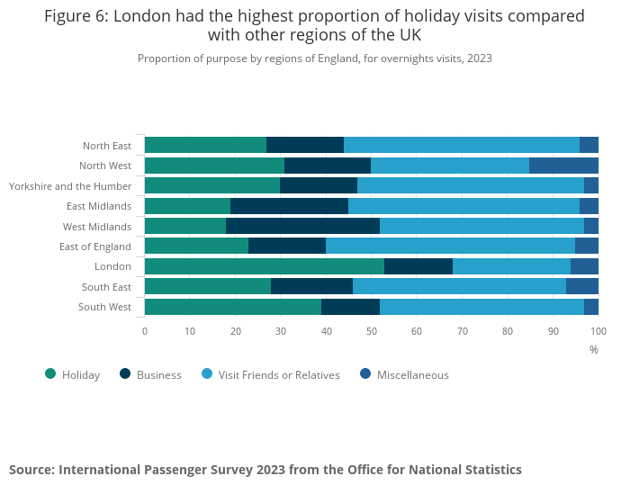 Figure 6: London had the highest proportion of holiday visits compared with other regions of the UK