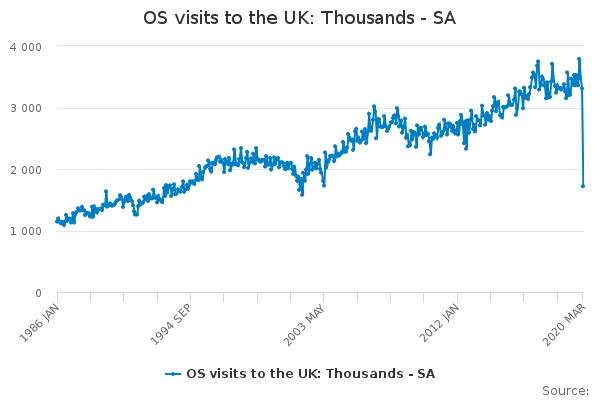 Download this time seriesOS visits to the UK: Thousands - SA