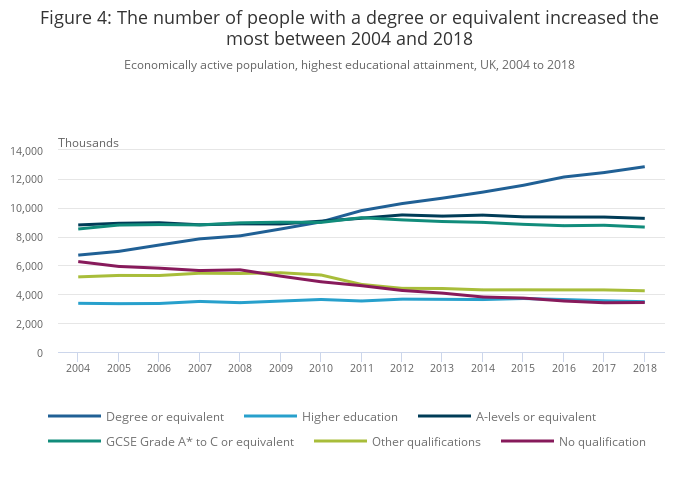Figure 4: The number of people with a degree or equivalent increased the most between 2004 and 2018