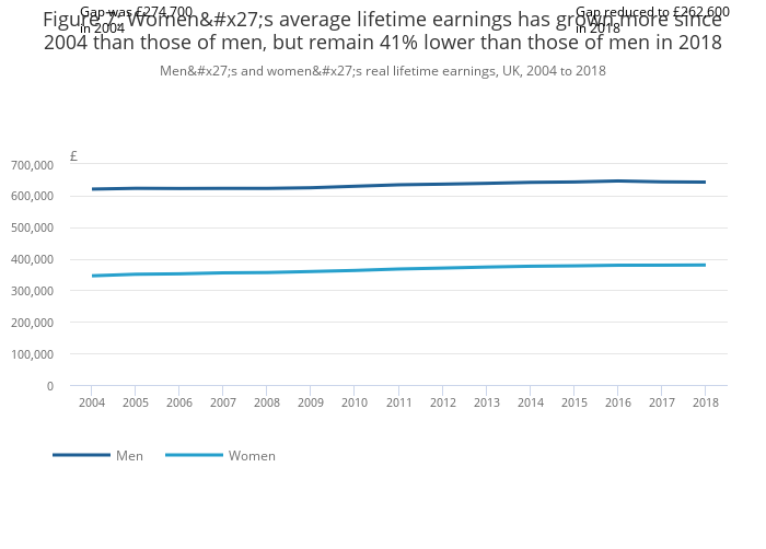 Download this chart Figure 7: Women's average lifetime earnings has grown more since 2004 than those of men, but remain 41% lower than those of men in 2018