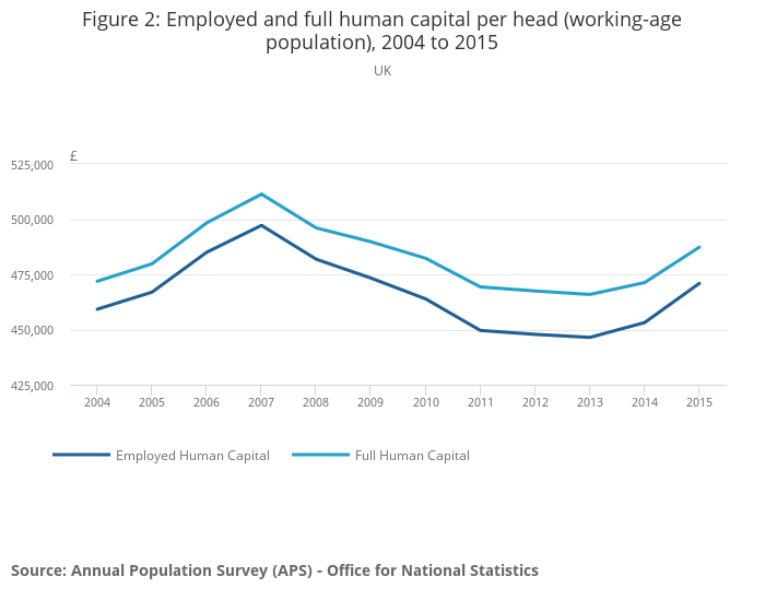 The value of employed human capital in the UK was £19.23 trillion in 2015 – an increase of £0.89 trillion (4.8%) from 2014 – surpassing its pre-economic downturn peak for the first time. However, the per head measure remains below pre-downturn levels.