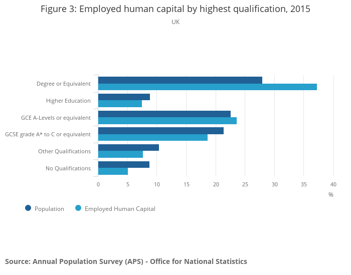 In 2015, on average, an individual with a degree or equivalent had human capital stock worth £628,000. In comparison, the average employed human capital stock for those with no qualifications was £274,000.