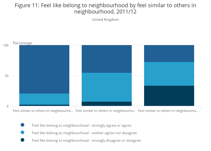 Data from Understanding Society 2011/12 indicate that nearly 2 out of 3 people (63%) feel they belong to their neighbourhood. There was an association between the feeling of belonging and feeling similar to others in the neighbourhood (Figure 11). Nearly 8 out of 10 (79%) of those who felt that they were similar to others in their neighbourhood also felt strongly that they belonged to their local area, compared to just under 3 out of 10 (27%) who did not feel similar to others in their neighbourhood.