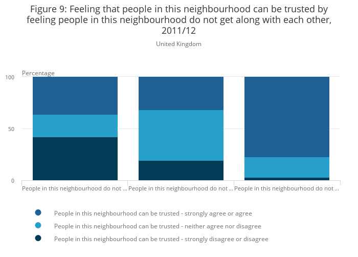 Data from Understanding Society, 2012/13 suggest that among those feeling that people in their neighbourhood get along with each other, three-quarters (77%) reported trusting others in their local area, and only 3% not trusting others in their local area. On the other hand, among those who reported feeling that people in their neighbourhood do not get along with each other, 42% did not trust others in their local area (Figure 9).