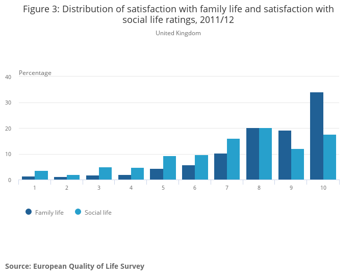Subjective measures of satisfaction could reflect the quality of relationships an individual has with family and friends. Satisfaction with both family life and social life has been shown to have a positive correlation with life satisfaction and happiness (Eurofound, 2012). The average ratings for satisfaction with family life and social life (as published in the National Well-being Wheel of Measures) were 8.2 and 7.1, respectively, out of 10 (Source: European Quality of Life Survey, 2011/12). Figure 3 shows the distribution of ratings for satisfaction with family life and with social life. A higher proportion of people (53%) rated their satisfaction with family life as very high (rating of 9 or 10 out of 10), compared to their satisfaction with social life (30%). A higher proportion of people (15%) rated their satisfaction with their social life as low (rating of 1 to 4 out of 10), compared to their satisfaction with family life (6%).