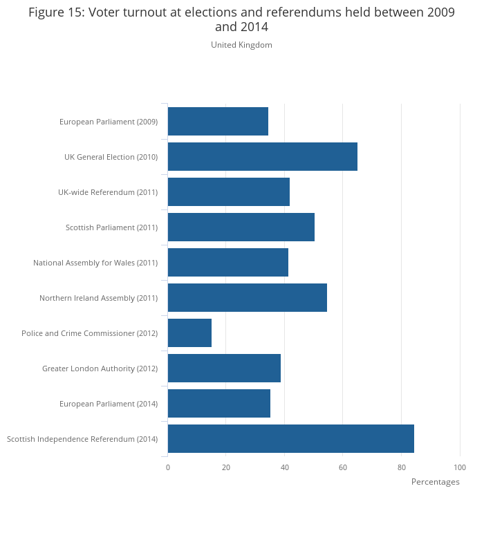 Figure 15 shows turnout at recent elections and referendums (not including local elections) between 2009 and 2014.