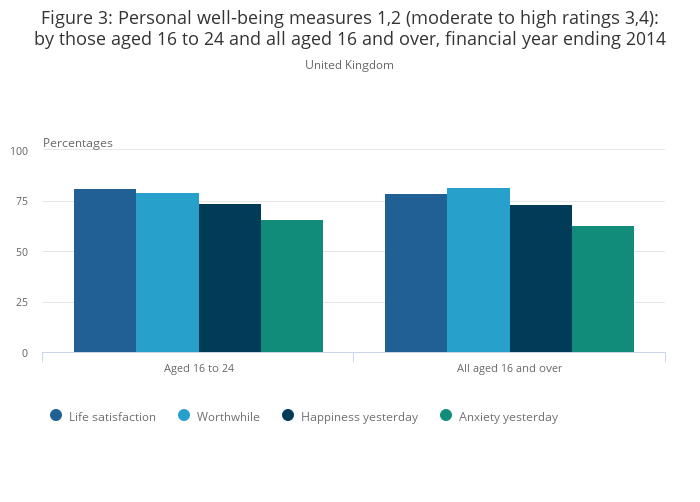 In the financial year ending 2014, more people in the UK were feeling positive about their lives than in the financial year ending 2012, according to questions on personal well-being. Young people were less likely than adults to feel a sense that the things they do in life are worthwhile, but more likely to report higher feelings of life satisfaction and happiness.