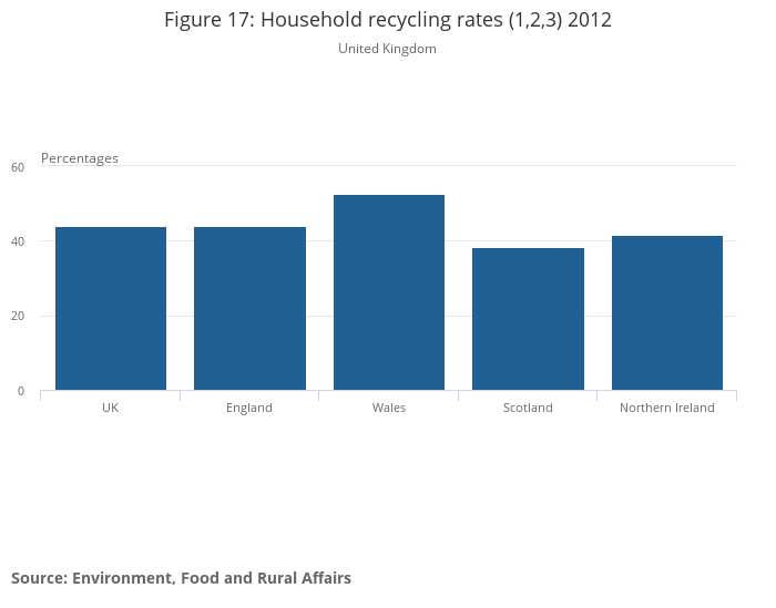 The UK is making progress towards key targets such as emissions of greenhouse gasses, renewable energy production and recycling. For example, the UK has a target to recycle compost or reuse at least 50% of the waste generated by households by 2020. In 2012, this figure was 43.9%, an increase of almost 4 percentage points compared with 2010. This figure varies across the constituent countries, and Wales has already exceeded the 2020 target, having recycled, composted or reused 52.5% of household waste in 2012.