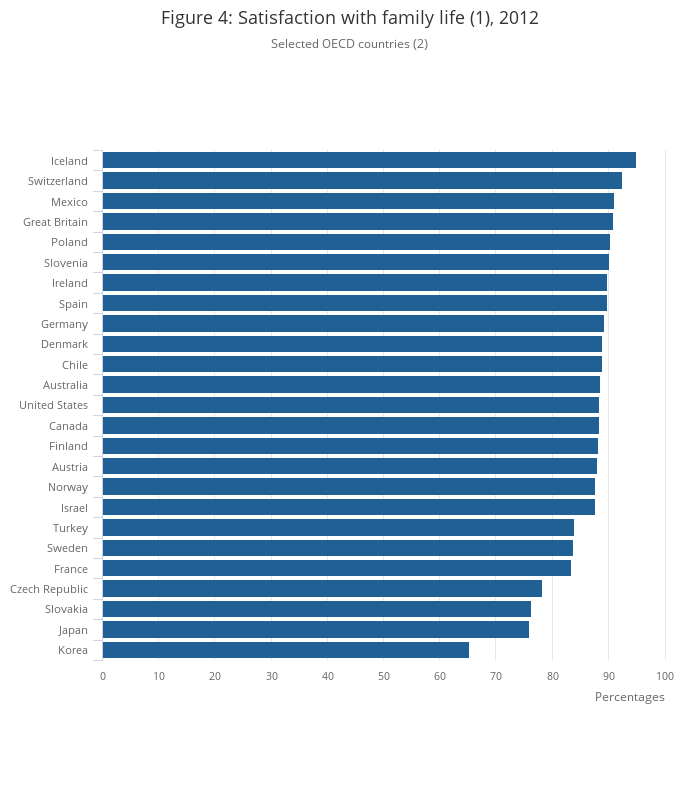 | Completely, very or fairly satisfied with family life | Great Britain (90.9%) | Iceland (95.1%) | Korea (65.3%) | Some OECD countries1 |