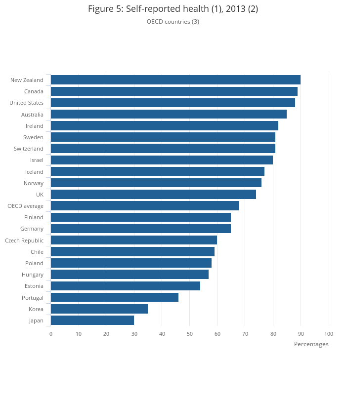 Nearly three-quarters (74%) of people in the UK reported being in good or better health in 2013, higher than the OECD average of 68%.