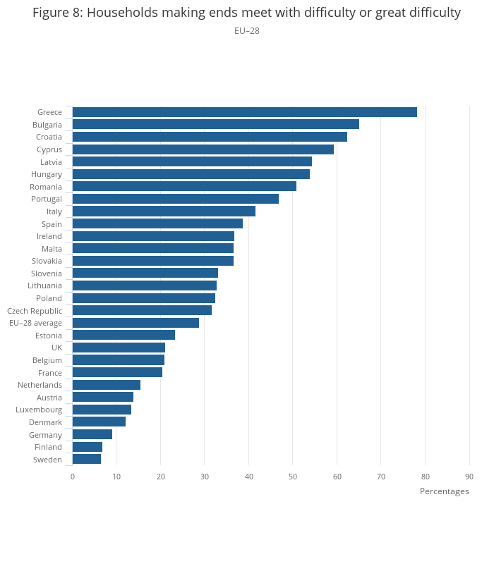 In 2013, over a fifth (21.1%) of all households in the UK reported great difficulty or difficulty in making ends meet (Figure 8). This was lower than the estimated EU–28 average of 28.9%, and was similar to Belgium (21.0%) and France (20.5%). The countries with the highest proportion of households reporting great difficulty or difficulty in making ends meet were Greece (78.3%) and Bulgaria (65.2%), while the lowest proportion of households were in Sweden (6.6%) and Finland (6.9%).