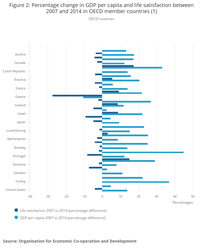 - All OECD countries except Greece showed an increase in GDP per capita between 2007 and 2014. Seven countries showed an increase in life satisfaction, seven showed no change, and 20 showed a decrease between 2007 and 2014.