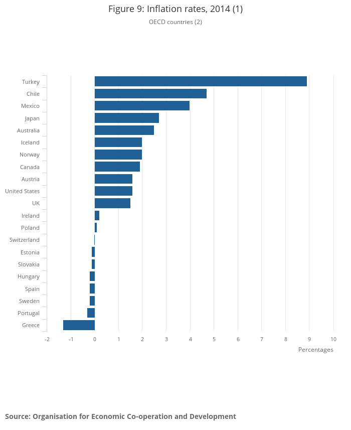According to data from the OECD, the UK had a rate of inflation (Consumer Price Indices)3 in 2014 of 1.5% which was similar to Austria and the United States (both 1.6%) (Figure 9). Turkey (8.9%) and Chile (4.7%) had the highest inflation rates, while some OECD countries experienced falling prices, for example, Greece (negative 1.3%) and Portugal (negative 0.3%).