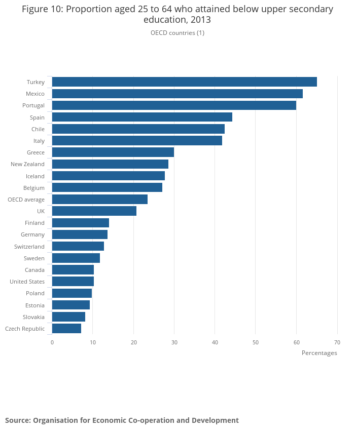 | Proportion of those aged 25 to 64 that attained below upper secondary education Source: OECD (2013) | 20.8% | Czech Republic (7.2%) | Turkey (65.2%) | OECD countries |