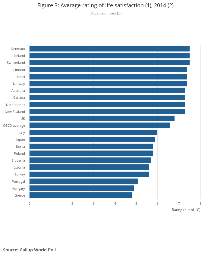 | Average (mean) rating of life satisfaction Source: OECD, (2014) | 6.8 out of 10 | Denmark, Iceland and Switzerland (7.5 out of 10) | Greece (4.8 out of 10) | OECD countries |