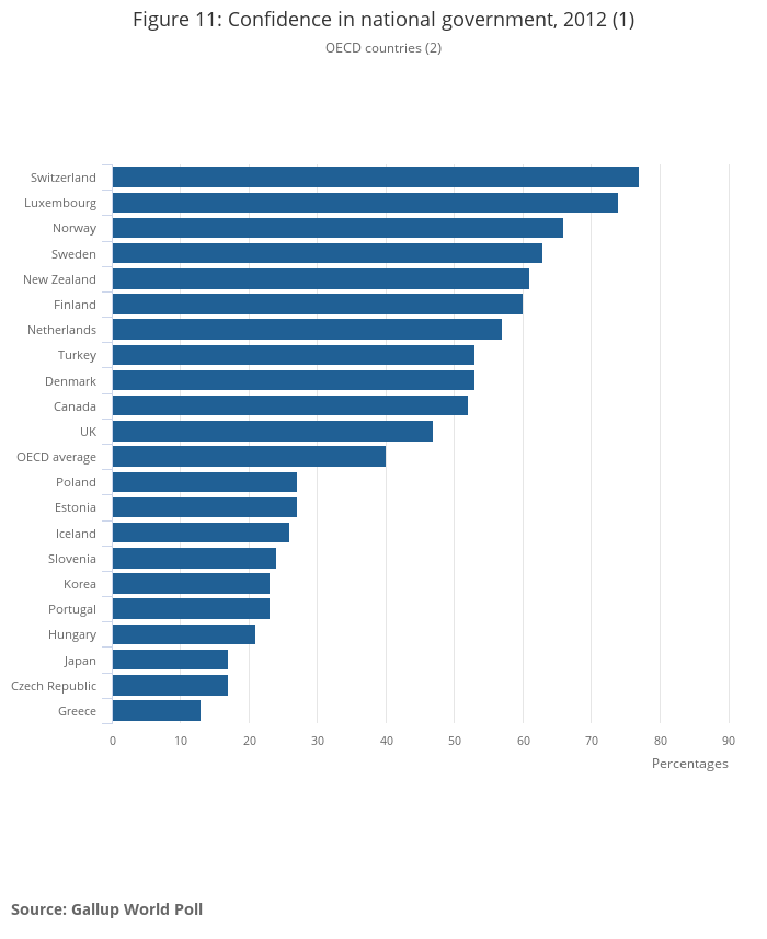 | Confidence in National Government Source: Gallup World Poll (2012) | 47% | Switzerland (77%) | Greece (13%) | OECD countries |