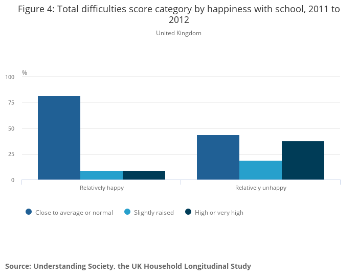 Image .csv .xlsChildren who reported being relatively unhappy with school in the 2011 to 2012 Understanding Society Survey had an average total difficulties score over 50% higher than children who reported being relatively happy with school (16.0 compared with 9.8). Figure 4 illustrates that children who were relatively unhappy with school were over 4 times more likely to report high or very high total difficulties scores than those children who were relatively happy with school (38% compared with 9%). The regression analysis showed that happiness with school was significantly associated with lower total difficulties, and had the fourth strongest relationship with total difficulties scores of the variables tested.