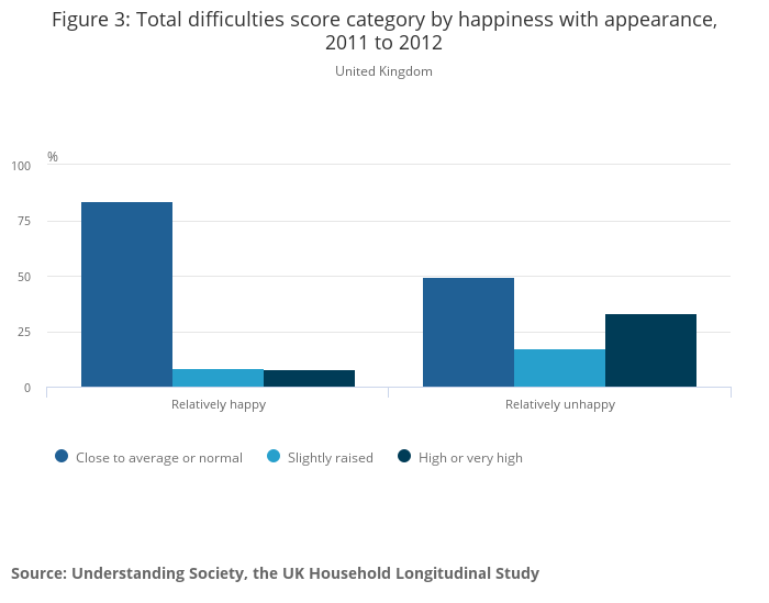 one third of children who were relatively unhappy with their appearance reported high or very high total difficulties score, compared with 1 in 12 children who were relatively happy with their appearance